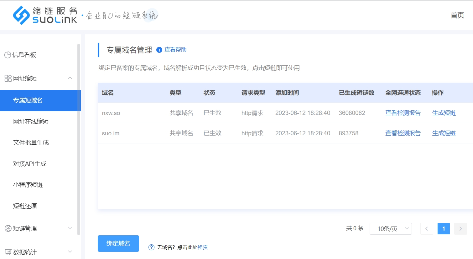 缩链短链接(suolink.cn),老牌短链平台,支持客户使用自有域名生成短链接,短链接可设置永久有效或定期失效,跳转稳定快速。支持绑定多个自有域名,推广过程出现问题可直接更换下一个域名,保障推广效率性。使用企业自有(品牌)域名生成短链接,推广时可有效提升链接辨识度与用户信任度,提高链接打开率和转化率,强化品牌知名度与影响力。