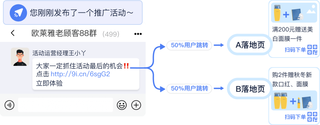 做什么:为同一个落地页创建两个不同的短链接(A和B),分别搭配不同的文案或图片进行推广。