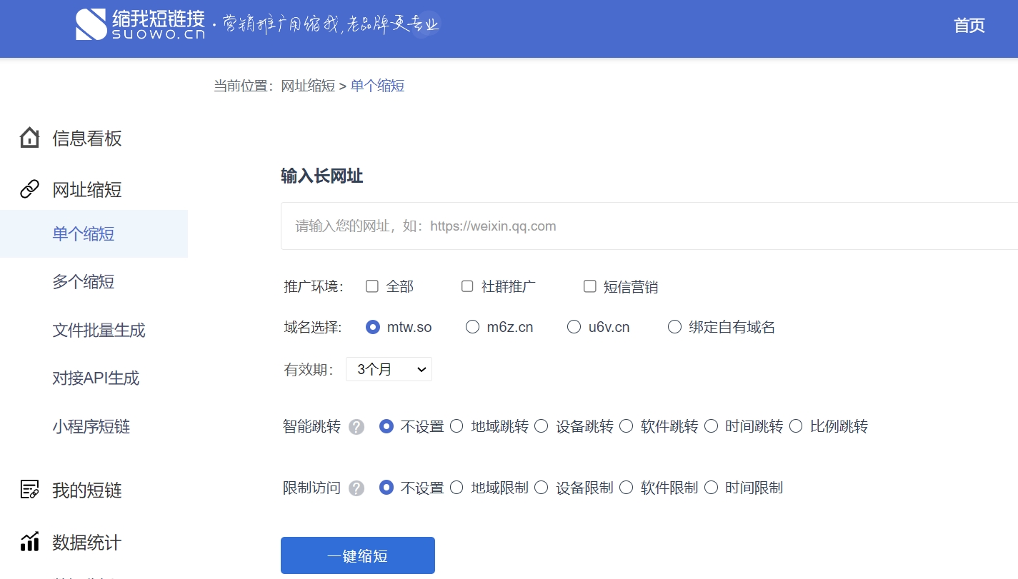 缩我短链接,10年老牌短链工具,使用用户多,安全稳定性好,支持长链接一键生成短链接,并自由设置短链接有效期,支持随时替换原链接,并提供短链接数据统计功能。缩我短链接,全网连通性好,稳定可靠,跳转快速,支持永久免费使用,帮助提升运营、推广、营销工作效率与效果。