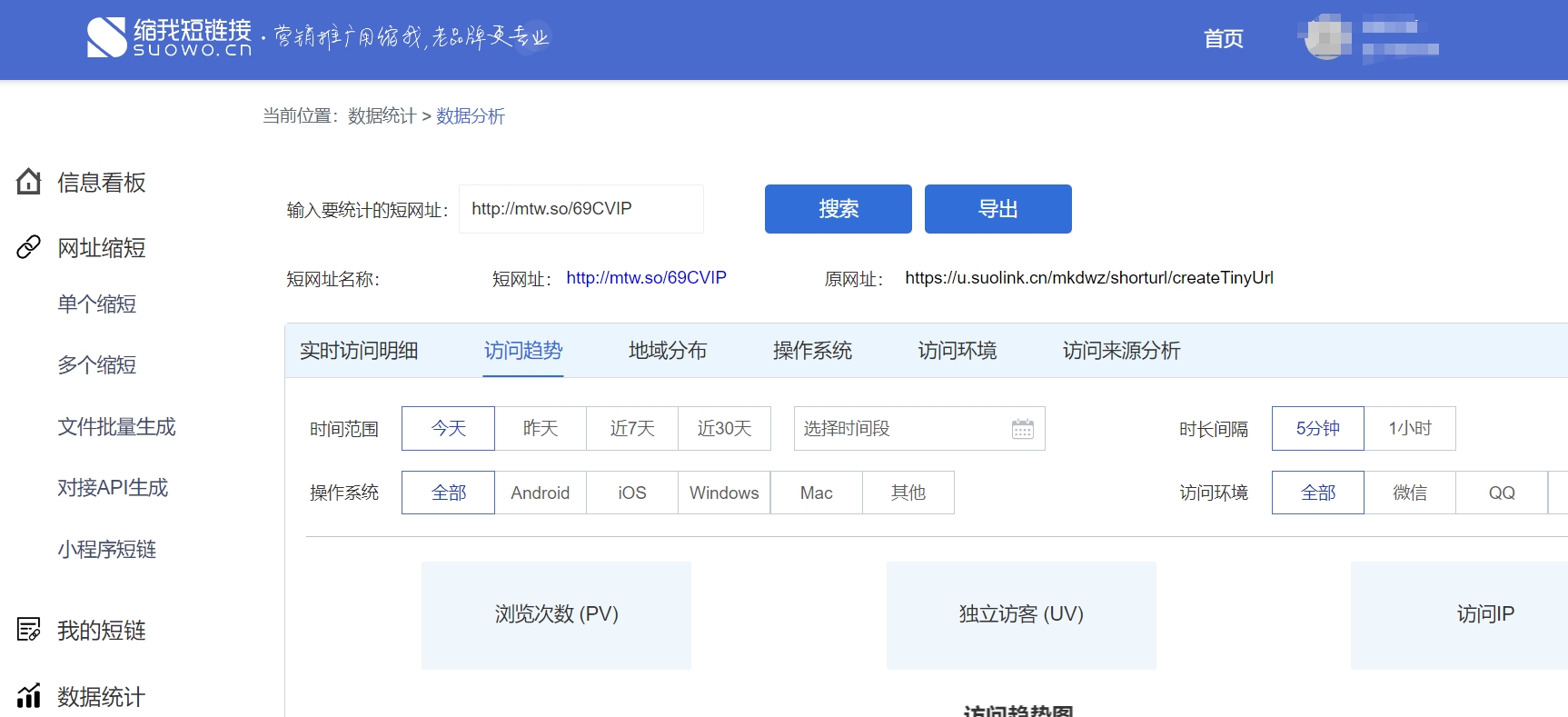 缩我短链接,全天候检测短链接访问数据,支持随时登录后台查看,包括pv、uv、ip数、用户来源地区、用户使用设备、详细ip记录明细等,数据及时更新,方便随时了解短链接推广情况,为营销推广提供有力支持,助力精细化营销,提升转化。